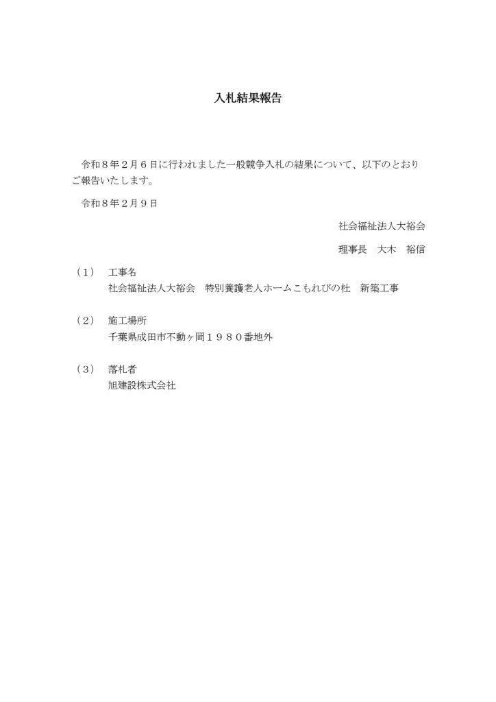 特別養護老人ホームこもれびの杜新築工事一般競争入札結果について